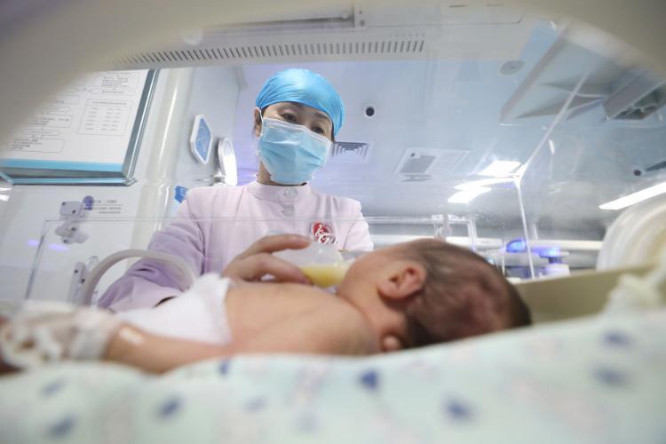 2026年1月1日,在河南省焦作市温县妇幼保健院新生儿科,护士为新生儿喂奶。新华社发(徐宏星摄)
